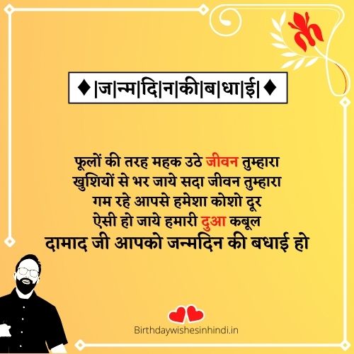 नमस्कार इस लेख में हमने कुछ बेहतरीन हैप्पी बर्थडे दामादजी (Happy birthday wishes to son in law) शुभकामनाएं लेकर आए हैं। हमारे दामादजी का जन्मदिन परिवार के लिए ख़ुशी का दिन होता है। हमारे दामाद जी हमें बहोत प्यार करते है और हमारे सुख दुःख में साथी हमारे साथी होते है। आप उन्हें Happy birthday my son in hindi सन्देश देकर उनके दिन को और भी खुशहाल बना सकते हैं। आप सास ससुर की तरफ से दामाद जी को जन्मदिन की बधाई (Birthday quotes son in law) सन्देश भेजकर जन्मदिन की शुभकामनाएं दे सकते हैं। आप दामाद को जन्मदिन की हार्दिक शुभकामनाएं संदेश (Quotes birthday wishes for son in law) भेजने के बाद उनको कैसा लगा ये हमें जरूर बताये।
